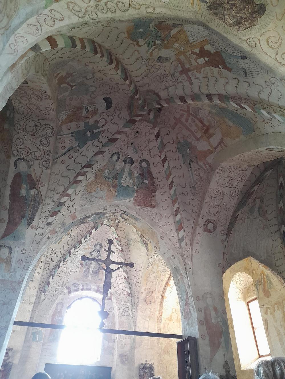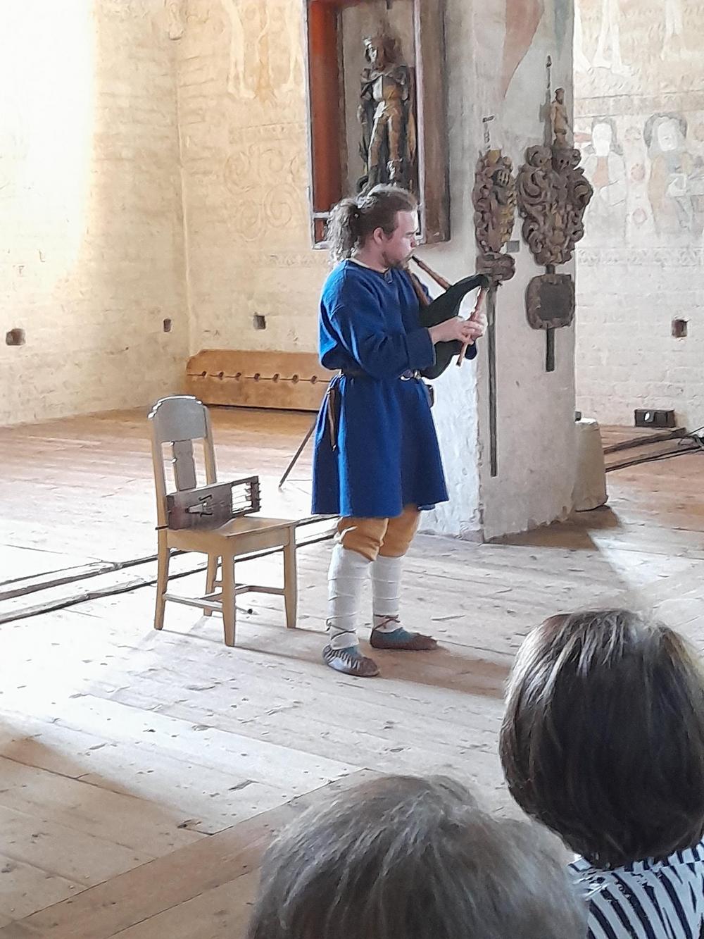 Hattulan Pyhänristin kirkko ja mahtava opas, joka soitti keskiaikaisia soittimia.